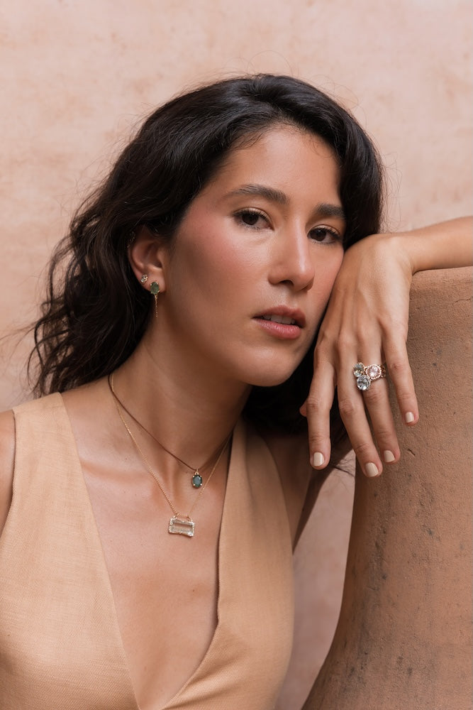 Piedras cuidadosamente seleccionadas aportan color, textura y vitalidad a cada joya, creando piezas únicas que capturan esencia, movimiento y elegancia natural.