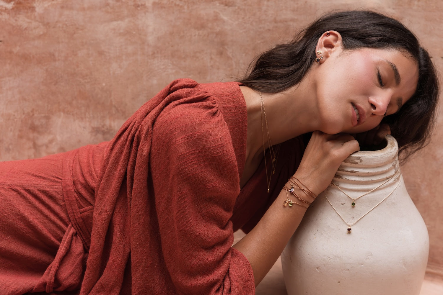 Piedras cuidadosamente seleccionadas aportan color, textura y vitalidad a cada joya, creando piezas únicas que capturan esencia, movimiento y elegancia natural.